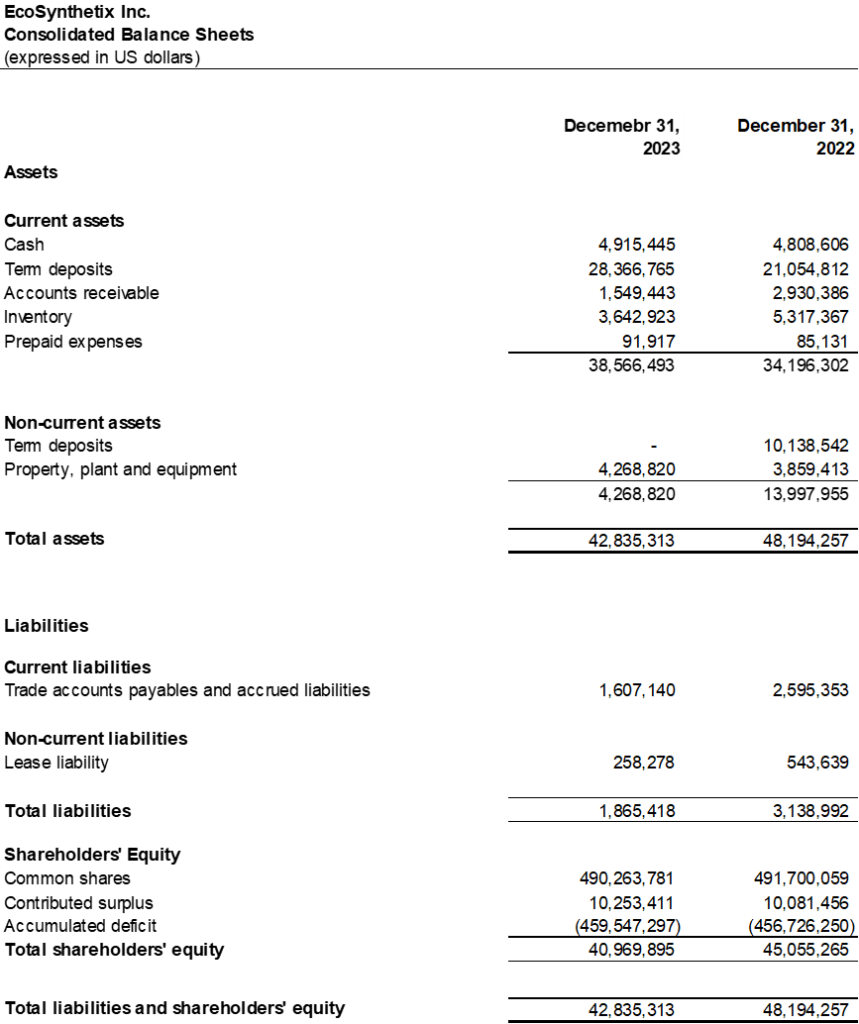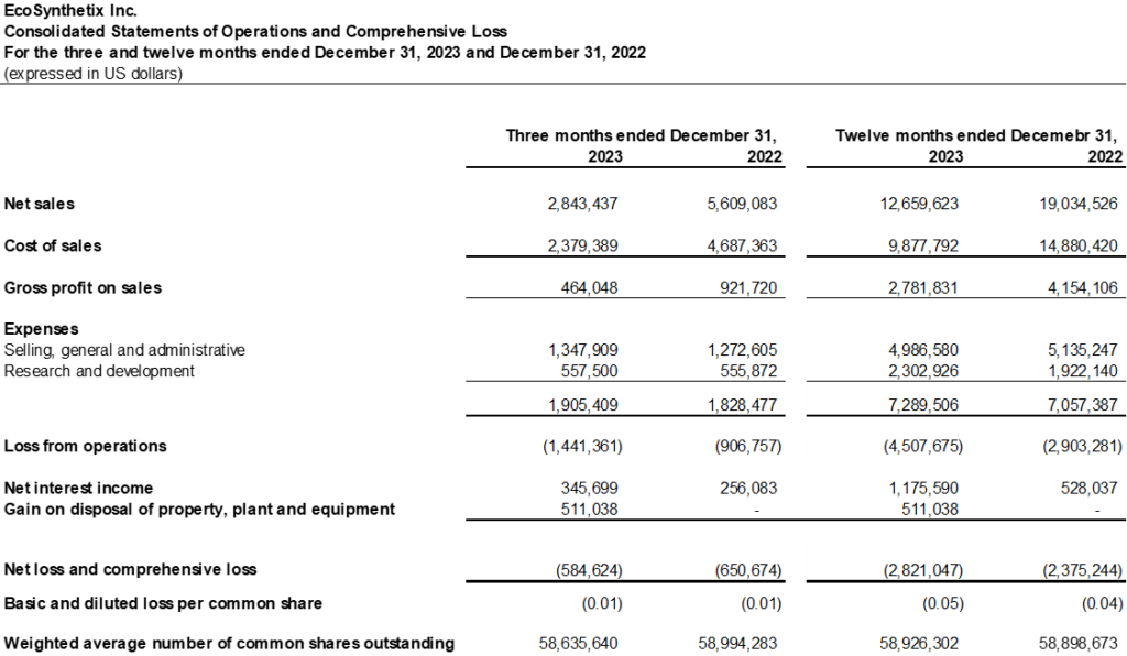 Burlington, Ontario, February 27, 2024 – EcoSynthetix Inc. (TSX: ECO) (“EcoSynthetix” or the “Company”),a renewable chemicals company that produces a portfolio of commercially proven bio-based products, today announced its financial and operational results for the three months (Q4 2023) and twelve months (FY 2023) ended December 31, 2023. Financial references are in U.S. dollars unless otherwise indicated.