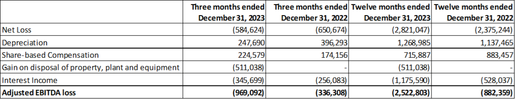 The following table reconciles net loss to Adjusted EBITDA loss for the three and twelve months ended December 31, 2023, and December 31, 2022: