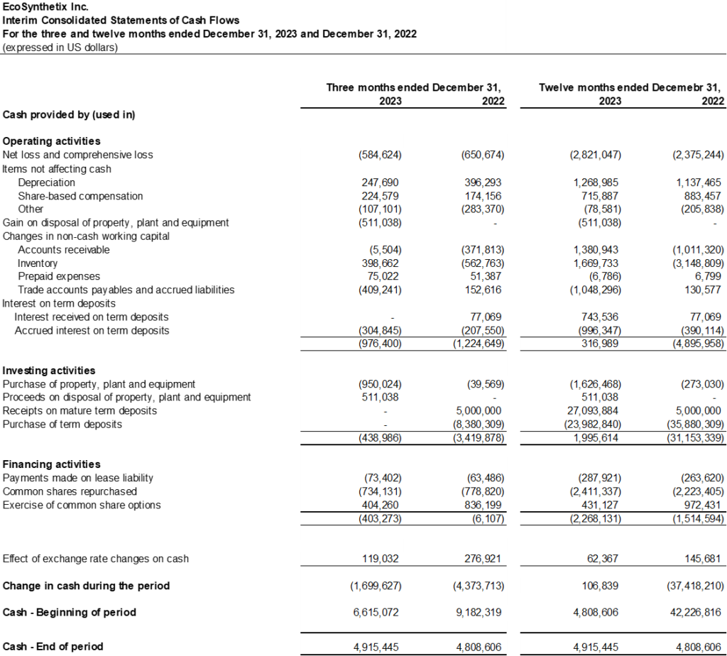 Cash on hand and term deposits were $33.3 million as at December 31, 2023 compared to $36.0 million as at December 31, 2022. The $2.7 million change was primarily due to $2.4 million for the purchase of shares through the normal course issuer bid (“NCIB”) and $1.6 million of cash used to purchase property, plant, and equipment primarily related to the Company’s manufacturing capacity realignment strategy, partially offset by $0.3 million cash-flow from operations. The Company purchased and cancelled 276,500 and 967,900 common shares under the NCIB during Q4 2023 and FY 2023, respectively.